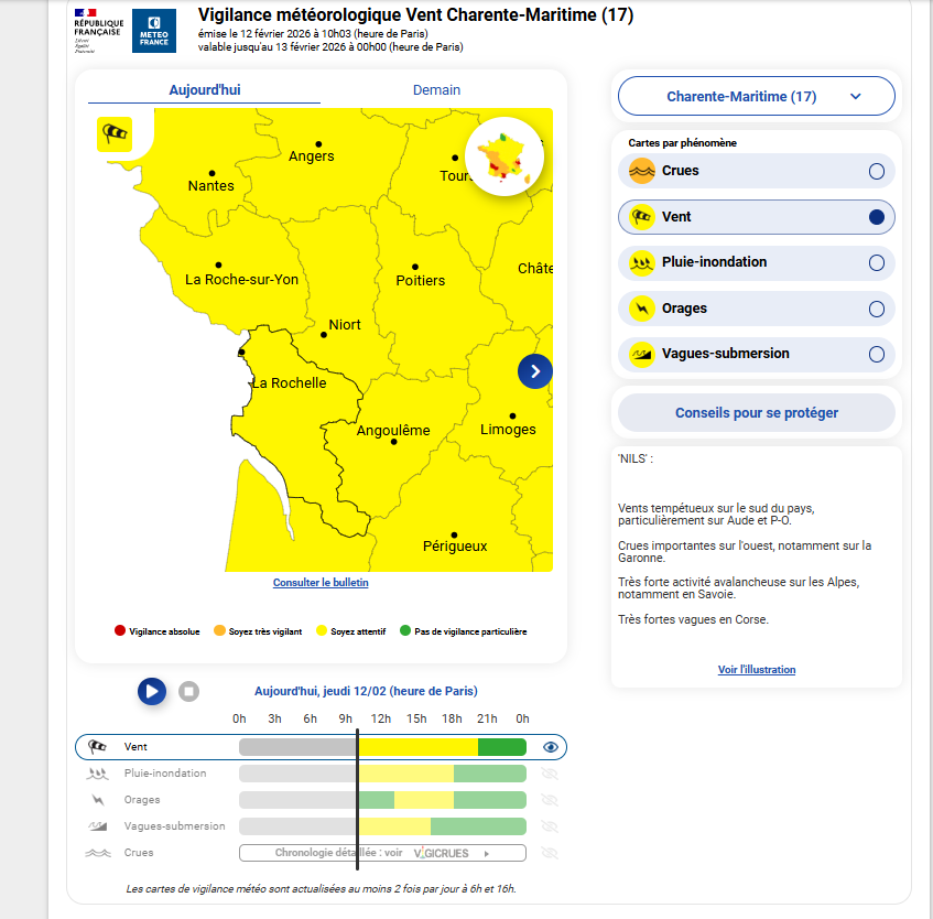 Bulletin de suivi départemental de la Vigilance : Charente-Maritime (17) Situation météorologique Faits nouveaux : suivi toujours en cours pour la vigilance orange pluie-inondation sur le département de la Corrèze (19) avec une fin de vigilance désormais fixée à 16h. Situation générale : le passage de la tempête NILS a apporté de très fortes rafales généralisées.Sur le…