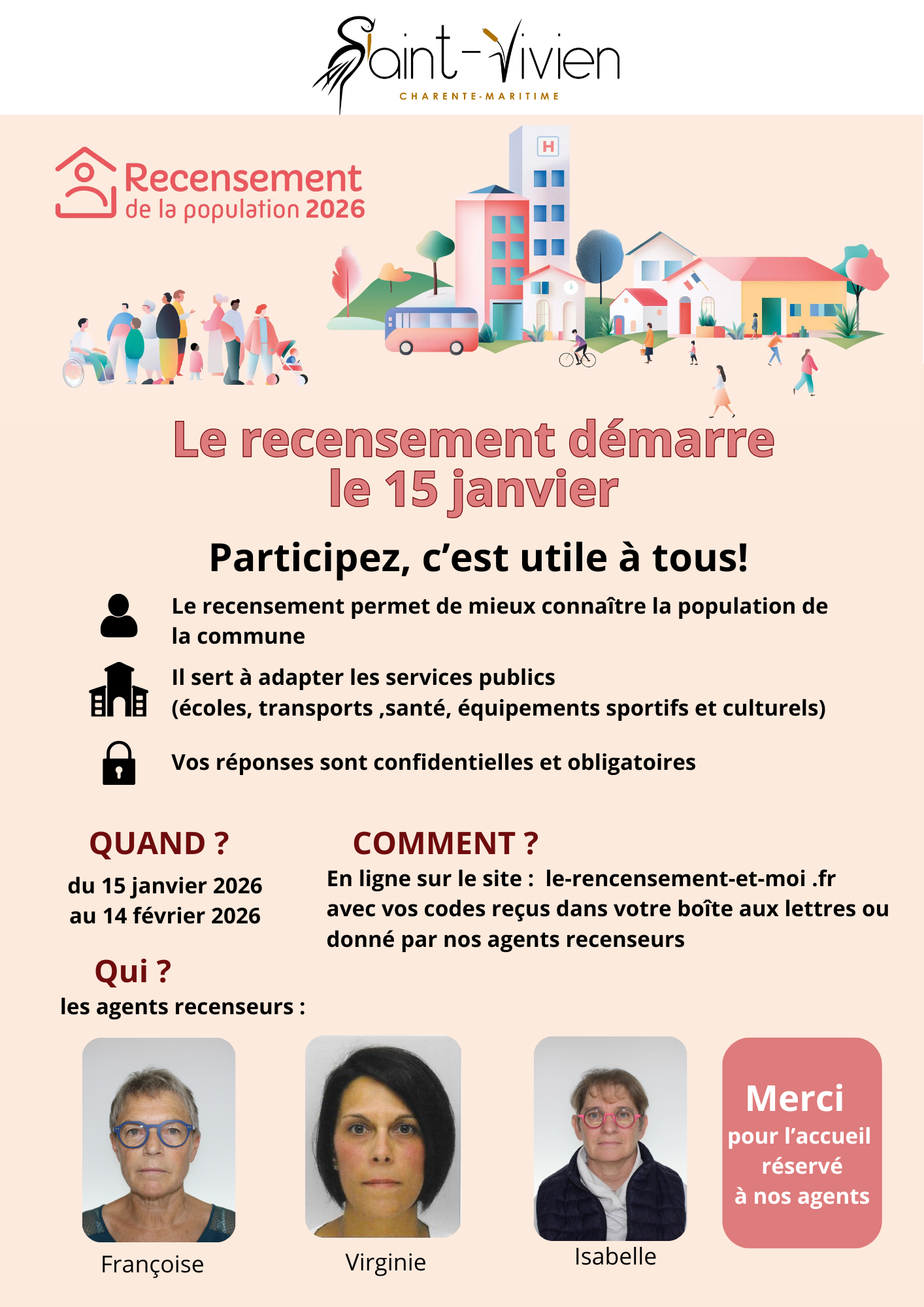 DU 15 JANVIER 2026 AU 14 FEVRIER 2026 Des chiffres pour construire demain Le recensement de la population est un acte civique, obligatoire, qui concerne tout le monde et qui profite à tous. C’est grâce aux données collectées lors du recensement de la population que les petits et grands projets qui vous concernent peuvent être…