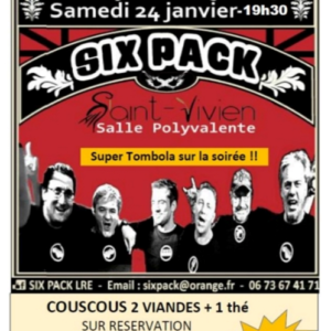 L’association Appimômes vous propose une soirée couscous animée avec le Concert Pop Rock « Six Pack » samedi 24 janvier 2026 à 19h30 dans la salle polyvalente. Réservation avant le 10/01/2026 Informations au 06.80.93.75.03