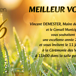Vincent DEMESTER, maire de Saint-Vivien et le Conseil Municipal vous souhaitent une excellente année 2026 et vous invitent le 11 janvier à la cérémonie des vœux à 11h00 dans la salle polyvalente.