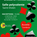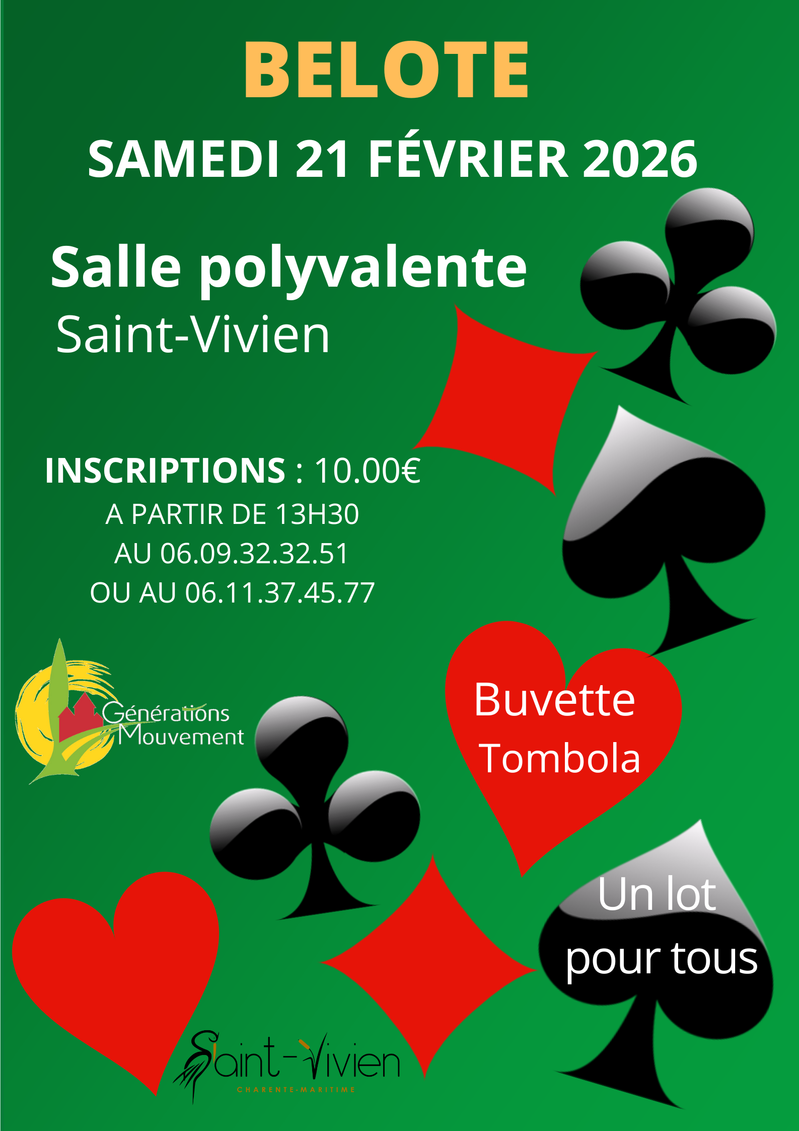 Samedi 21 février 2026, à partir de 13h30 dans la salle polyvalente, L’association Génération Mouvements vous invite à participer à son concours de belote dans une ambiance conviviale et sportive.