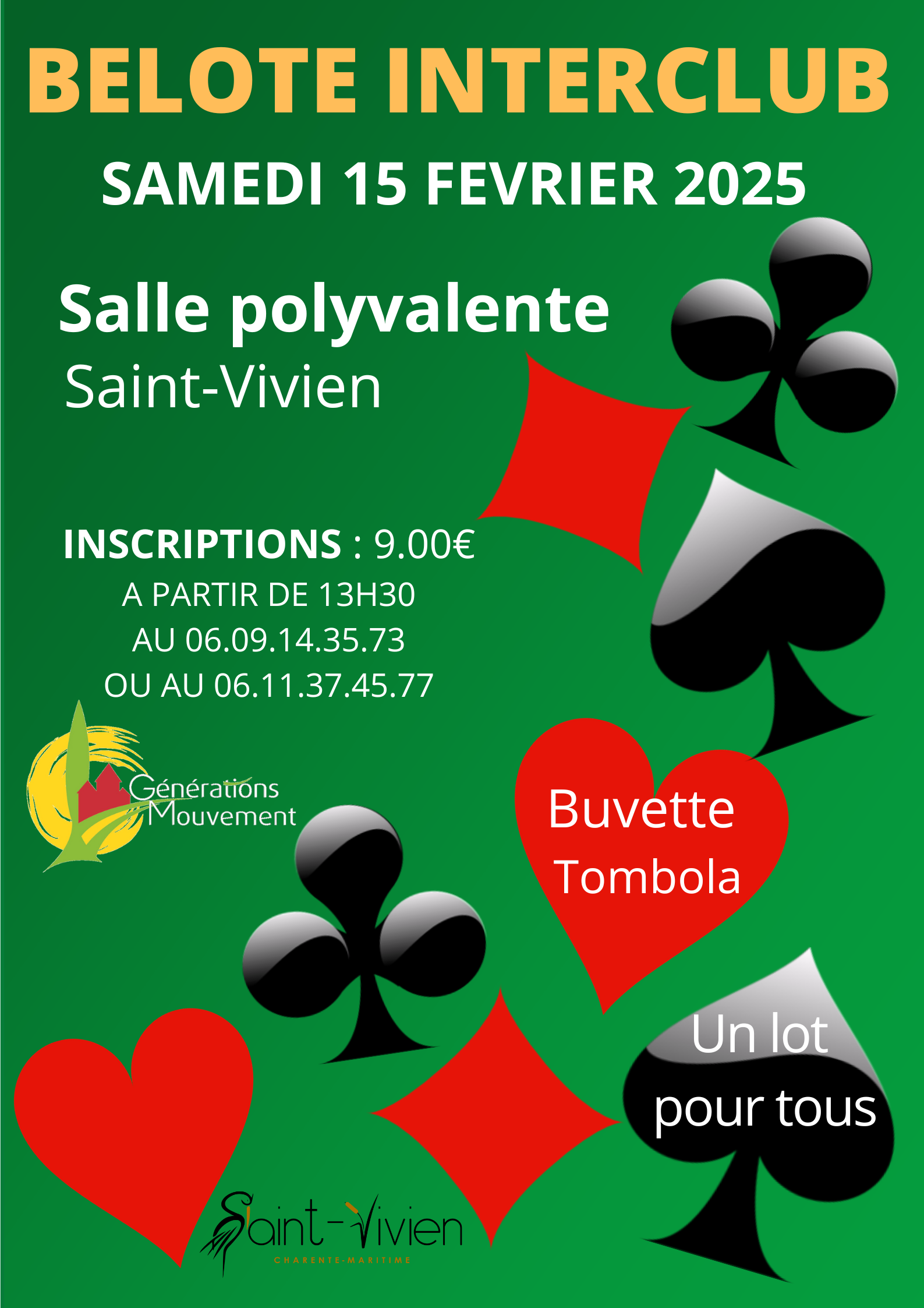 Générations Mouvement organise un concours de belote le samedi 15 Février 2025 à la salle polyvalente de Saint-Vivien