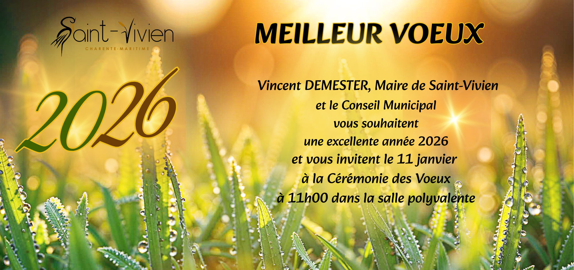 Vincent DEMESTER, maire de Saint-Vivien et le Conseil Municipal vous souhaitent une excellente année 2026 et vous invitent le 11 janvier à la cérémonie des vœux à 11h00 dans la salle polyvalente.