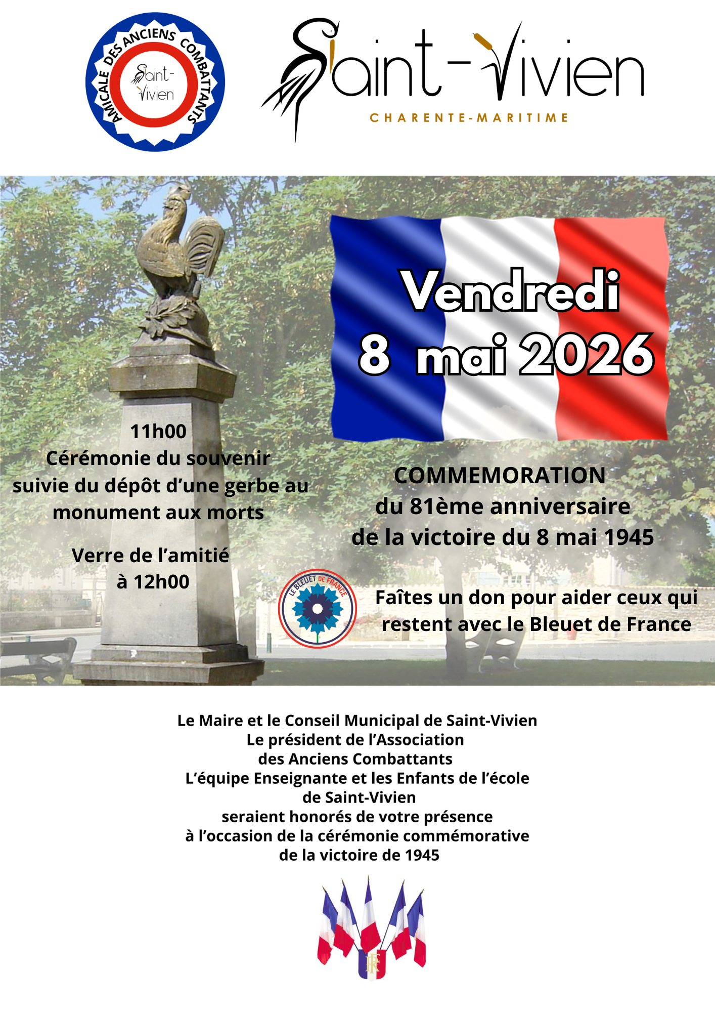 Vendredi 08 mai 2026 à 11h se déroulera cérémonie du 81e anniversaire de la victoire du 8 mai 1945 saluant la victoire des Alliés sur l’Allemagne nazie et la fin de la Seconde Guerre mondiale. Elle sera suivie du dépôt de gerbe au monument aux morts.
