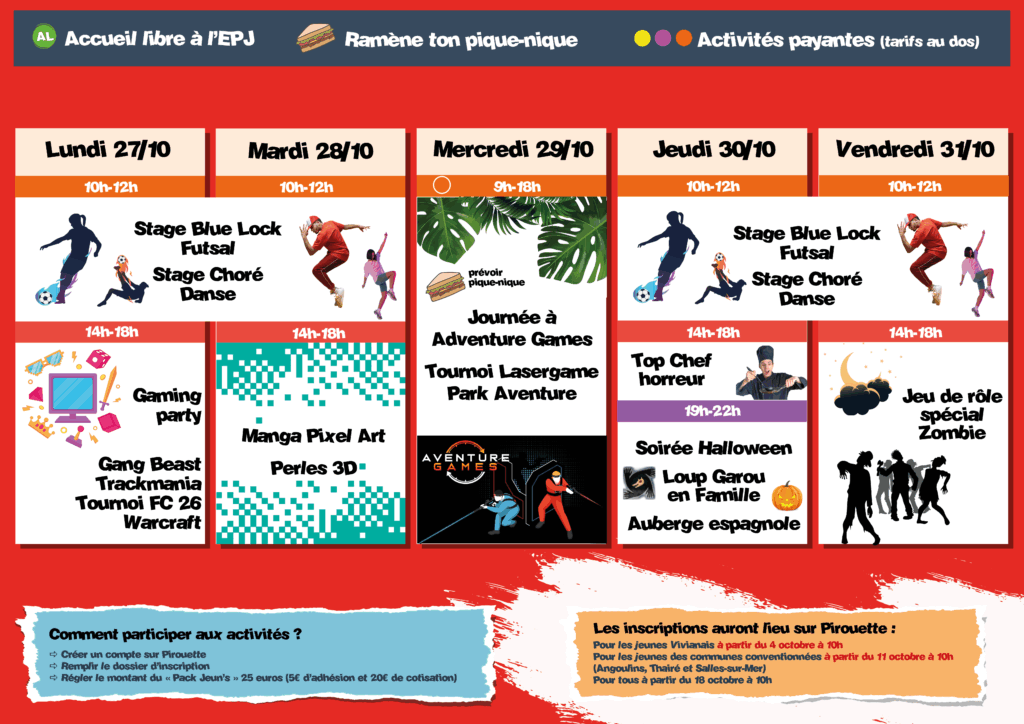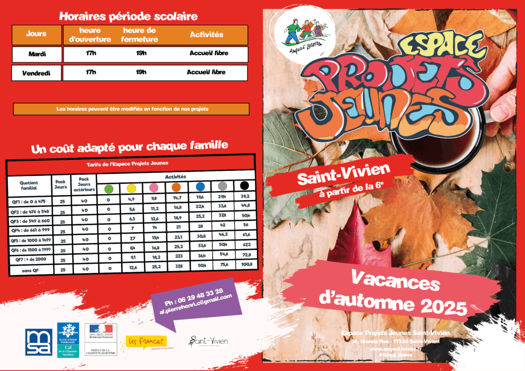 VACANCES D’AUTOMNE EPJ SAINT-VIVIEN 6 octobre 2025 Inscrivez vous vite pour les vacances d’automne sur la plateforme Pirouette d’Angoul’loisirs du 27 au 31 octobre Facebook Twitter LinkedIn Email Imprimer